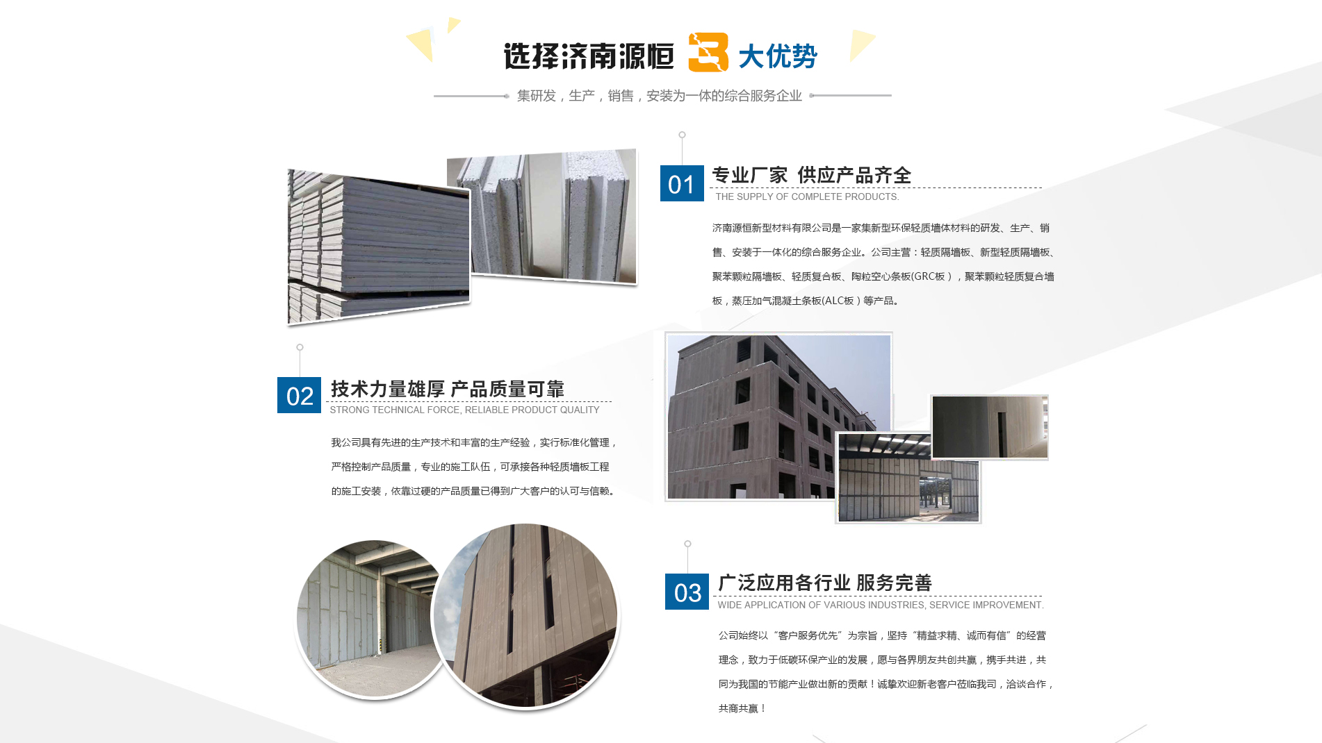 濟(jì)南源恒新型材料有限公司坐落于美麗的泉城濟(jì)南,是集新型環(huán)保輕質(zhì)墻體材料的研發(fā)、生產(chǎn)、銷售、安裝于一體化的綜合服務(wù)企業(yè)。我公司具有的生產(chǎn)技術(shù)和豐富的生產(chǎn)經(jīng)驗(yàn),為您提供輕質(zhì)隔墻板、新型輕質(zhì)隔墻板、聚苯顆粒隔墻板、輕質(zhì)復(fù)合板、陶粒空心條板(GRC板),聚苯顆粒輕質(zhì)復(fù)合墻板,蒸壓加氣混凝土條板(ALC板)等產(chǎn)品,本公司有專的施工隊(duì)伍,可承接各種輕質(zhì)墻板工程的施工安裝。輕質(zhì)隔墻板是國(guó)家推廣使用的新型輕質(zhì)、綠色無(wú)害建材,是墻改節(jié)能政策大力扶持的環(huán)保節(jié)能產(chǎn)品,是發(fā)達(dá)國(guó)家普遍采用的新型墻體材料。濟(jì)南源恒新型材料有限公司實(shí)行標(biāo)準(zhǔn)化管理,嚴(yán)格控制產(chǎn)品質(zhì)量,依靠過硬的產(chǎn)品質(zhì)量已得到廣大客戶的認(rèn)可與信賴。公司產(chǎn)品遍布各大城市,與國(guó)內(nèi)多家客戶建立了良好的合作關(guān)系。公司始終以“客戶服務(wù)優(yōu)先”為宗旨,堅(jiān)持“精益求精、誠(chéng)而有信”的經(jīng)營(yíng)理念,致力于低碳環(huán)保產(chǎn)業(yè)的發(fā)展,愿與各界朋友共創(chuàng)共贏,攜手共進(jìn),共同為我國(guó)的節(jié)能產(chǎn)業(yè)做出新的...